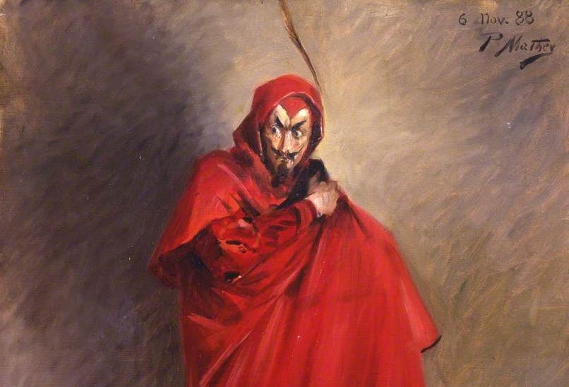 得到了上帝的默许,魔鬼也是信心满满,踌躇满志的来到世间找浮士德。在此他化名为:梅菲斯特(Mephistopheles)。